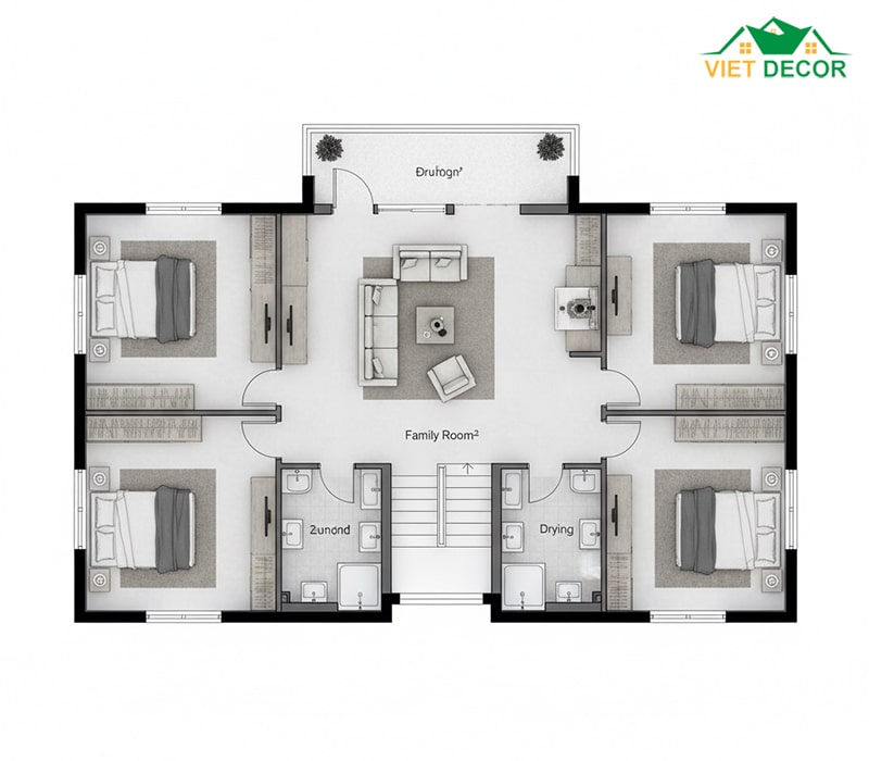 Tầng 2 là khu vực nghỉ ngơi chính. 4 phòng ngủ (trong đó có 1 Phòng Master lớn) được bố trí khoa học. Phòng sinh hoạt chung (khoảng 10m² - 12m²) nên đặt ở trung tâm để kết nối 4 phòng, thúc đẩy tương tác gia đình. Phòng thờ được bố trí ở nơi yên tĩnh, trang trọng hướng ra mặt tiền. Sân phơi cần được tối ưu hóa ở khu vực phía sau để đảm bảo thẩm mỹ mặt tiền và khả năng phơi nắng.