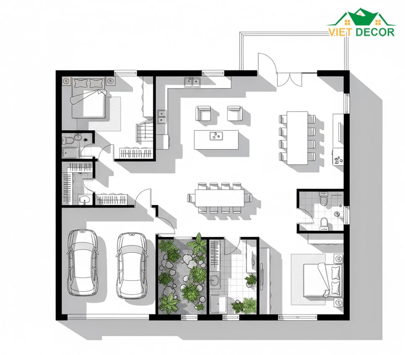 Giếng trời là giải pháp kỹ thuật cực kỳ hiệu quả để giải quyết vấn đề thiếu sáng và thông gió ở những khu vực trung tâm nhà. Đối với mẫu nhà 2 tầng 150m² có chiều sâu lớn, việc đặt giếng trời ở khu vực cầu thang hoặc giữa nhà giúp dẫn luồng khí và ánh sáng tự nhiên sâu vào tất cả các tầng, tạo ra sự đối lưu lý tưởng cho toàn bộ 5 phòng ngủ. Đây là một khoản đầu tư xứng đáng cho chất lượng không khí.