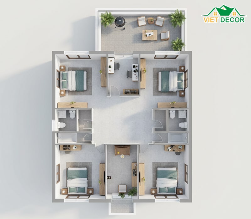 4 Phòng ngủ còn lại được thiết kế với diện tích thoải mái (15m² - 20m²), đảm bảo ánh sáng và thông gió riêng biệt. Tầng 2 có thể tích hợp thêm các phòng chức năng đặc thù như phòng làm việc riêng, phòng Gym hoặc khu vực đọc sách yên tĩnh. Sân thượng lớn (20m²+) là nơi lý tưởng để tổ chức tiệc BBQ ngoài trời hoặc làm vườn rau sạch, nâng cao chất lượng sống cũng như kết nối giữa các thành viên trong gia đình.