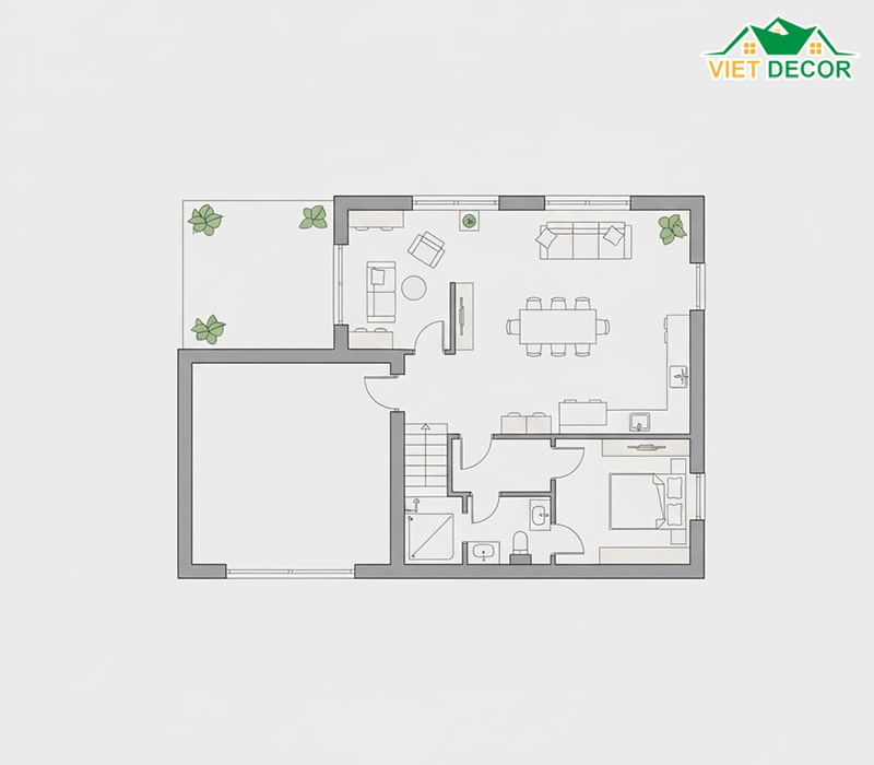 Trong kịch bản diện tích sàn giới hạn (khoảng 105m² - 120m² mỗi tầng), giải pháp hàng đầu là tối giản hành lang và sử dụng không gian mở cho khu vực sinh hoạt chung để tạo cảm giác rộng rãi.